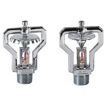 早期抑制快速響應(ESFR)噴頭是指在熱的作用下,在預定的溫度范圍內自行啟動,使水以一定的形態(tài)和密度在設計的保護面積上分布,以達到早期抑制效果的一種噴頭裝置。該噴頭專為對付高危險度的火災而設計,采用?2.5mm高強度快速反應玻璃球,具有響應時間短,流量大,水滴直徑大,滅火效率高等性能,以早期抑制和冷卻的方式對付火災,所以更適用于高堆垛與高架貨物的保護。